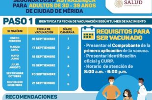 Leer Mas ...A partir del jueves 16 de septiembre se aplicarán segundas dosis a personas de 30 a 39 años en Mérida