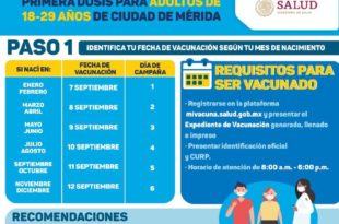 Leer Mas ...Aplicación de primeras dosis contra el Coronavirus a jóvenes de 18 a 29 años de Mérida se realizará del martes 7 al domingo 12 de septiembre
