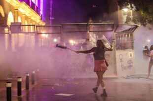 Las manifestantes replegadas con chorros de agua por los granaderos, quienes además les tiraron gas …
